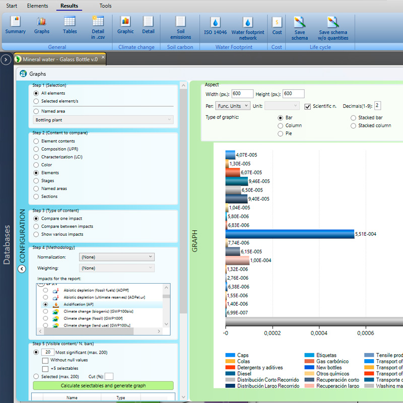 Air.e allows you to report the results not only in a practically instantaneous manner, but in the format and with the level of detail that you want. In the form of charts, in the form of tables, such as pre-formatted reports. All ready to export to Word, Excel, PDF, image or simply copy and paste into another tool. With the level of detail you want: by process, by stage, by type, UPR, LCI, with data on activity, with factors of emissions ready to verify... and combining any impact of any methodology.
