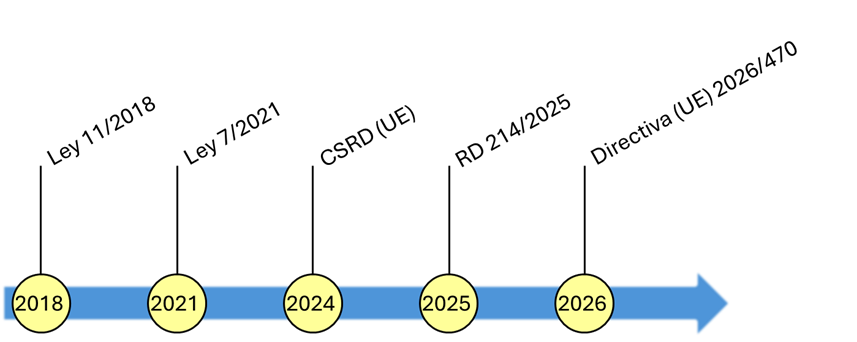 This regulatory framework draws a roadmap that evolves from the mere transparency of Law 11/2018 and the climate commitment of Law 7/2021, toward a much stricter accountability model. With the arrival of the CSRD and Directive (EU) 2026/470, transposed at the national level by RD 214/2025, companies move from reporting voluntarily to being legally required to manage their carbon footprint and sustainability risks throughout their value chain under unified European standards.